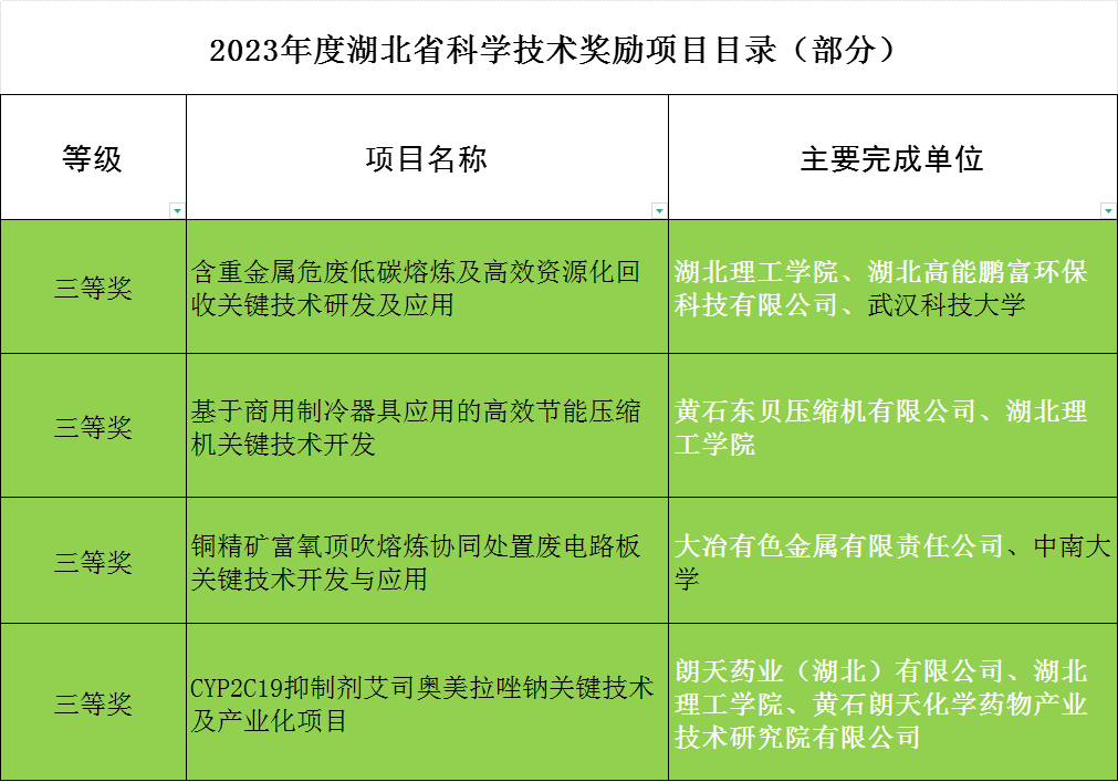 近日,湖北省政府辦公廳印發(fā)了《省人民政府關(guān)于2023年度湖北省科學(xué)技術(shù)獎(jiǎng)勵(lì)的決定》,黃石14項(xiàng)科研成果榜上有名! 其中,我區(qū)獲得省科學(xué)技術(shù)進(jìn)步獎(jiǎng)三等獎(jiǎng)4項(xiàng) 這4項(xiàng)獲獎(jiǎng)項(xiàng)目分別為湖北理工學(xué)院“含重金屬危廢低碳熔煉及高效資源化回收關(guān)鍵技術(shù)研發(fā)及應(yīng)用”、“基于商用制冷器具應(yīng)用的高效節(jié)能壓縮機(jī)關(guān)鍵技術(shù)開發(fā)”、大冶有色金屬有限責(zé)任公司“銅精礦富氧頂吹熔煉協(xié)同處置廢電路板關(guān)鍵技術(shù)開發(fā)與應(yīng)用”、朗天藥業(yè)(湖北)有限公司“CYP2C19抑制劑艾司奧美拉唑鈉關(guān)鍵技術(shù)及產(chǎn)業(yè)化項(xiàng)目”。 近年來,我區(qū)積極引導(dǎo)企業(yè)與高校、科研院所進(jìn)行關(guān)鍵技術(shù)、核心技術(shù)聯(lián)合攻關(guān),共同研究開發(fā)新技術(shù)、新產(chǎn)品,形成一批具有自主知識產(chǎn)權(quán)的科技創(chuàng)新成果,進(jìn)一步提升企業(yè)自主創(chuàng)新能力,加快科研成果轉(zhuǎn)化為現(xiàn)實(shí)生產(chǎn)力。鼓勵(lì)企業(yè)創(chuàng)建企校聯(lián)合創(chuàng)新中心、企業(yè)重點(diǎn)實(shí)驗(yàn)室等研發(fā)機(jī)構(gòu),激發(fā)企業(yè)技術(shù)創(chuàng)新的內(nèi)生動(dòng)力,使其真正成為研究開發(fā)投入的主體、技術(shù)創(chuàng)新活動(dòng)的主體、創(chuàng)新成果應(yīng)用的主體。
