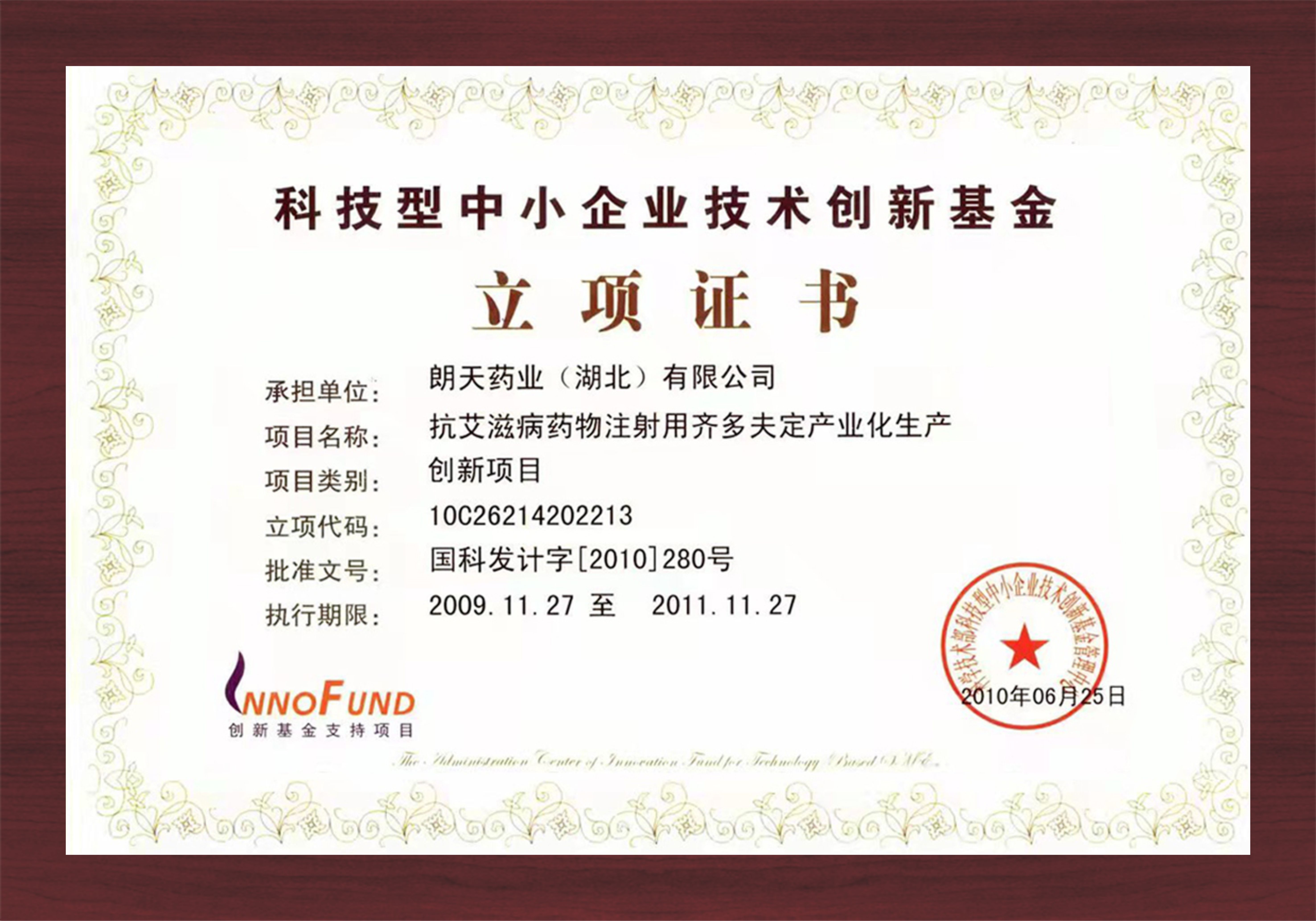 科技型中小企業(yè)技術(shù)創(chuàng)新基金立項證書