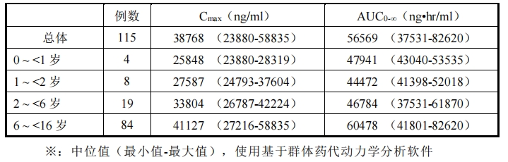 對兒科患者 115 例(4 個月~15 歲)單次靜脈滴注 10mg/kg(體重 60kg 以上的劑量為