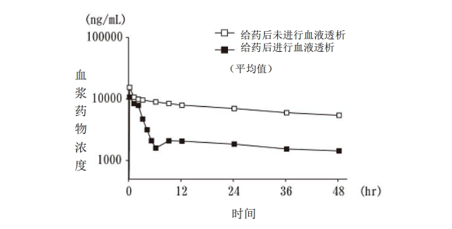 小時后開始進(jìn)行 4 小時血液透析,血漿藥物濃度約降低 1/4(國外人的數(shù)據(jù))。