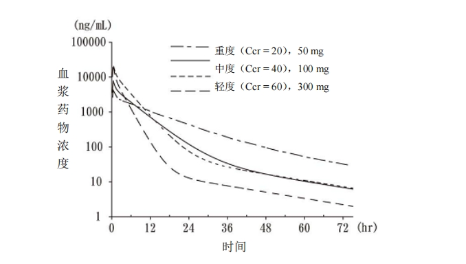 各腎功能損害者組中,劑量調(diào)整時(相當(dāng)于 300mg)的血漿藥物濃度曲線如圖 2。此