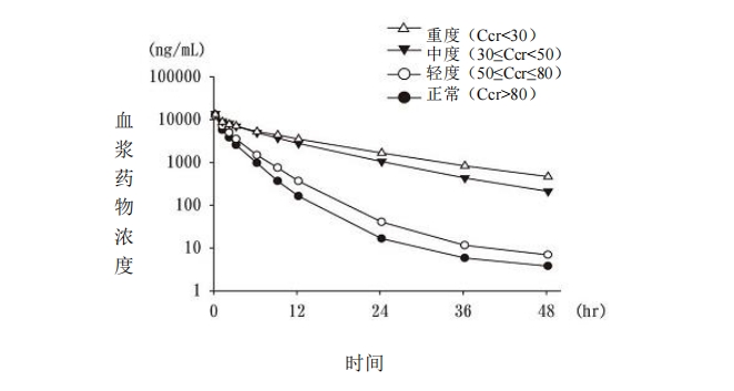 ![]() 圖 3 單次給藥時的血漿藥物濃度(腎功能損害者)