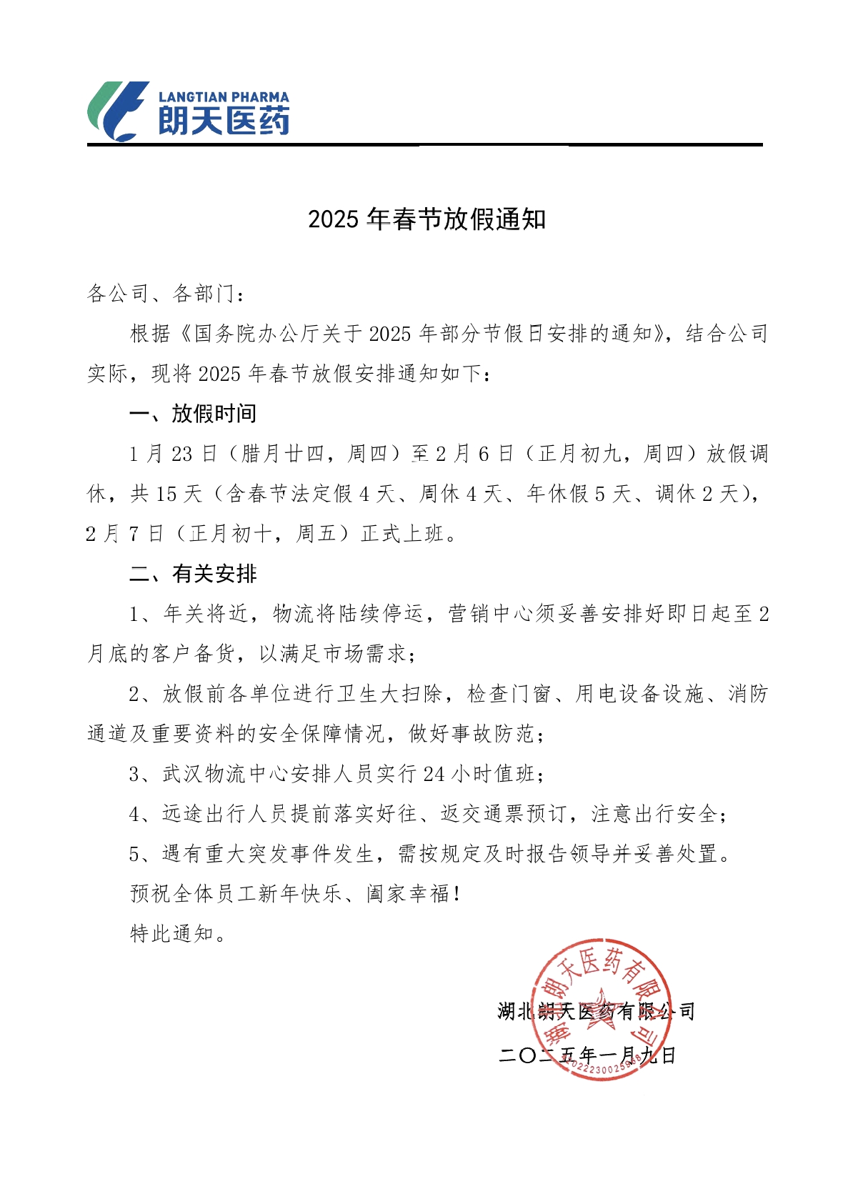 朗天醫(yī)藥集團(tuán)2025 年春節(jié)放假通知