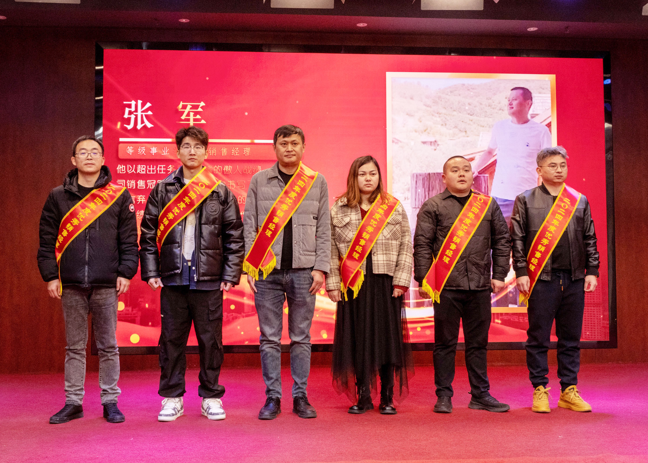 圖為:授予張軍等6人“優(yōu)秀銷售經(jīng)理”榮譽(yù)稱號(hào)