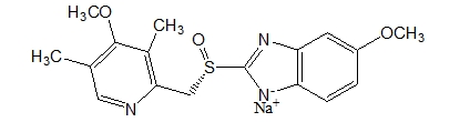 本品主要成份為艾司奧美拉唑鈉?;瘜W名稱:5-甲氧基-2-[(S)-[(4-甲氧基-3,5-二甲基-2-吡啶基)甲基]亞硫?;鵠-1H-苯并咪唑鈉鹽 化學結(jié)構(gòu)式為: